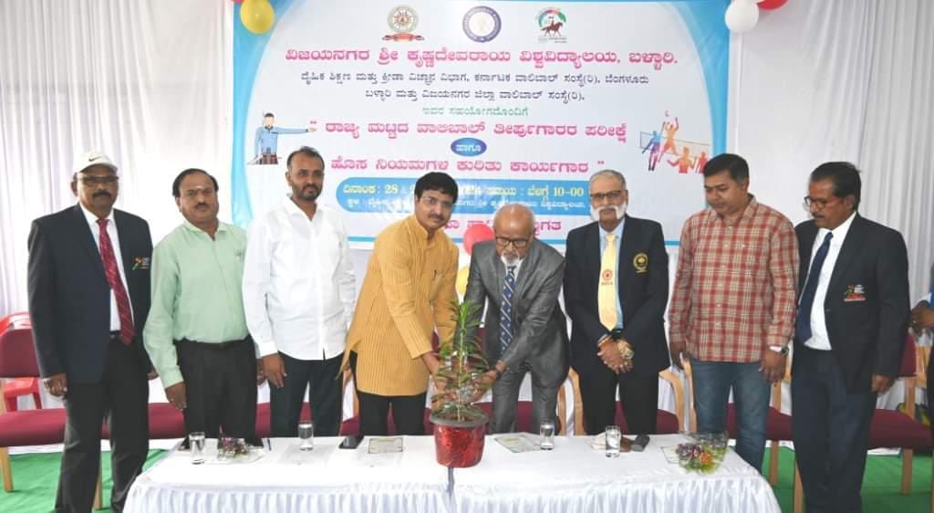 ವಿಜಯನಗರ ಶ್ರೀ ಕೃಷ್ಣದೇವರಾಯ ವಿಶ್ವವಿದ್ಯಾಲಯದ ದೈಹಿಕ ಶಿಕ್ಷಣ ಮತ್ತು ಕ್ರೀಡಾ ವಿಜ್ಞಾನ ವಿಭಾಗ, ಕರ್ನಾಟಕ ವಾಲಿಬಾಲ್ ಸಂಸ್ಥೆ ಬೆಂಗಳೂರು, ಬಳ್ಳಾರಿ ಮತ್ತು ವಿಜಯನಗರ ಜಿಲ್ಲಾ ವಾಲಿಬಾಲ್ ಸಂಸ್ಥೆಯ ಸಹಯೋಗದೊಂದಿಗೆ ವಿವಿಯಲ್ಲಿ ಶುಕ್ರವಾರ ಆಯೋಜಿಸಿದ್ದ ‘ರಾಜ್ಯಮಟ್ಟದ ವಾಲಿಬಾಲ್ ತೀರ್ಪುಗಾರರ ಪರೀಕ್ಷೆ ಹಾಗೂ ಹೊಸ ನಿಯಮಗಳ ಕುರಿತು ಕಾರ್ಯಗಾರವನ್ನು ಡಾ.ಹೆಚ್.ಡಿ.ಕೃಷ್ಣಪ್ಪ ಅವರು ಸಸಿಗೆ ನೀರ್ ಉಣಿಸುವುದರ ಮೂಲಕ ಉದ್ಘಾಟಿಸಿ ಅವರು ಮಾತನಾಡಿದರು.
