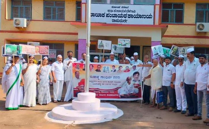 ಬೆಳಗಾವಿ ಜಿಲ್ಲೆ ರಾಮದುರ್ಗ ಪಟ್ಟಣದ ತೇರಬಜಾರದಲ್ಲಿರುವ ಗಾಂಧಿ ಪುತ್ತಳಿಗೆ ಪುಷ್ಪನಮನ ಸಲ್ಲಿಸಿ ಪಾದಯಾತ್ರೆ ಮುಖಾಂತರ ತಾಲೂಕಾ ಪಂಚಾಯತ ಶಾಸಕರ ಕಚೇರಿಯಲ್ಲಿ ಬ್ಲಾಕ್ ಕಾಂಗ್ರೆಸ್ ಅಧ್ಯಕ್ಷ ಜಿ.ಬಿ. ರಂಗನಗೌಡರ ಅವರು ಪ್ರತಿಜ್ಞೆ ವಿಧಿ ಸಲ್ಲಿಸಿ ಮಾತನಾಡಿದರು