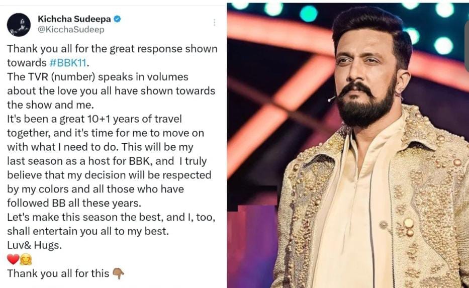 ಬಿಗ್ ಬಾಸ್ ಕನ್ನಡ 11 ಕಾರ್ಯಕ್ರಮಕ್ಕೆ ಅತ್ಯುತ್ತಮ ಪ್ರತಿಕ್ರಿಯೆ ನೀಡಿದ್ದಕ್ಕೆ ನಿಮಗೆಲ್ಲ ಧನ್ಯವಾಗಳು. ಸಿಕ್ಕಿರುವ ಟಿಆರ್ಪಿ ನೋಡಿದರೆ ನನ್ನ ಬಗ್ಗೆ ಮತ್ತು ಈ ಶೋ ಬಗ್ಗೆ ನೀವು ತೋರಿಸಿ ಪ್ರೀತಿ ಏನೆಂಬುದು ತಿಳಿಯುತ್ತದೆ. ಈ 10 ಪ್ಲಸ್ 1 ವರ್ಷ ನಿಮ್ಮೊಂದಿಗೆ ಪಯಣ ಮಾಡಿದ್ದು ಚೆನ್ನಾಗಿತ್ತು. ಈಗ ನಾನು ಬೇರೆ ಕಡೆಗೆ ಗಮನ ಹರಿಸುವ ಸಮಯ ಬಂದಿದೆ’ ಎಂದು ಸುದೀಪ್ ಅವರು ಹೇಳಿದ್ದಾರೆ.