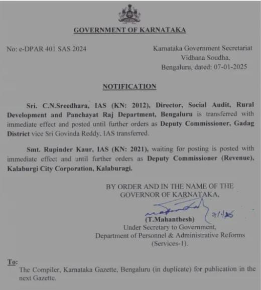 ಶ್ರೀ. ಸಿ.ಎನ್.ಶ್ರೀಧರ, ಐಎಎಸ್ (ಕೆಎನ್: 2012), ನಿರ್ದೇಶಕರು, ಸಾಮಾಜಿಕ ಲೆಕ್ಕ ಪರಿಶೋಧನೆ, ಗ್ರಾಮೀಣಾಭಿವೃದ್ಧಿ ಮತ್ತು ಪಂಚಾಯತ್ ರಾಜ್ ಇಲಾಖೆ, ಬೆಂಗಳೂರು ಅವರನ್ನು ತಕ್ಷಣದಿಂದ ಜಾರಿಗೆ ಬರುವಂತೆ ವರ್ಗಾವಣೆ ಮಾಡಲಾಗಿದೆ. ಮತ್ತು ಮುಂದಿನ ಆದೇಶದವರೆಗೆ ಗದಗ ಜಿಲ್ಲಾ ಉಪ ಆಯುಕ್ತರಾಗಿ ಶ್ರೀ ಗೋವಿಂದ ರೆಡ್ಡಿ, ಐಎಎಸ್ ವರ್ಗಾವಣೆ ಮಾಡಲಾಗಿದೆ.ನೇಮಕಗೊಳಿಸಿ ರಾಜ್ಯ ಸರ್ಕಾರ ಆದೇಶ ಹೊರಡಿಸಿದೆ.