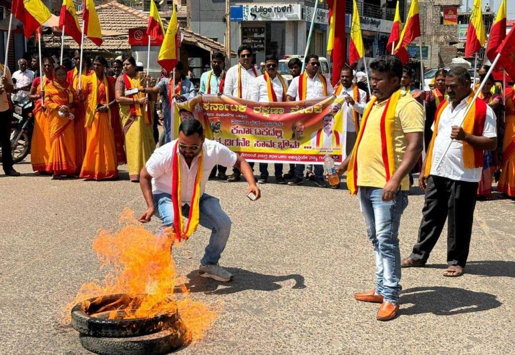 ಎಂಇಎಸ್ ಪುಂಡರು ಮಾಡಿರುವ ಹಲ್ಲೆಯನ್ನು ಖಂಡಿಸಿ ಟಾಯರಿಗೆ ಬೆಂಕಿ ಹಚ್ಚಿ ಪ್ರತಿಭಟನೆ ನಡೆಸಿದರು.