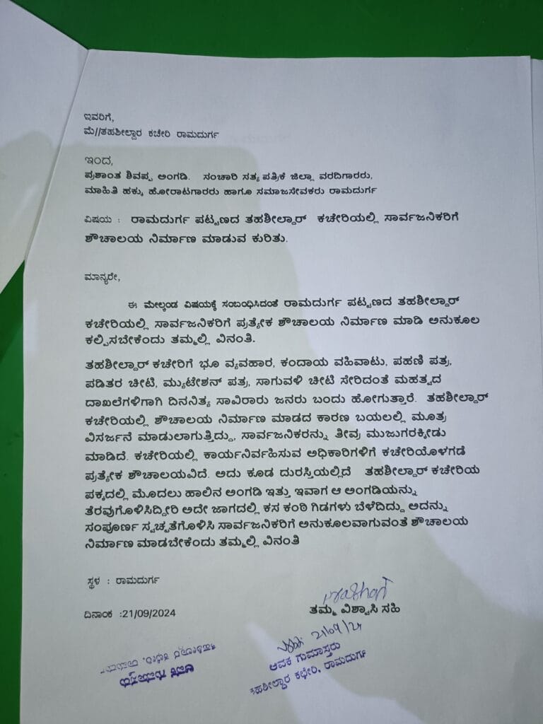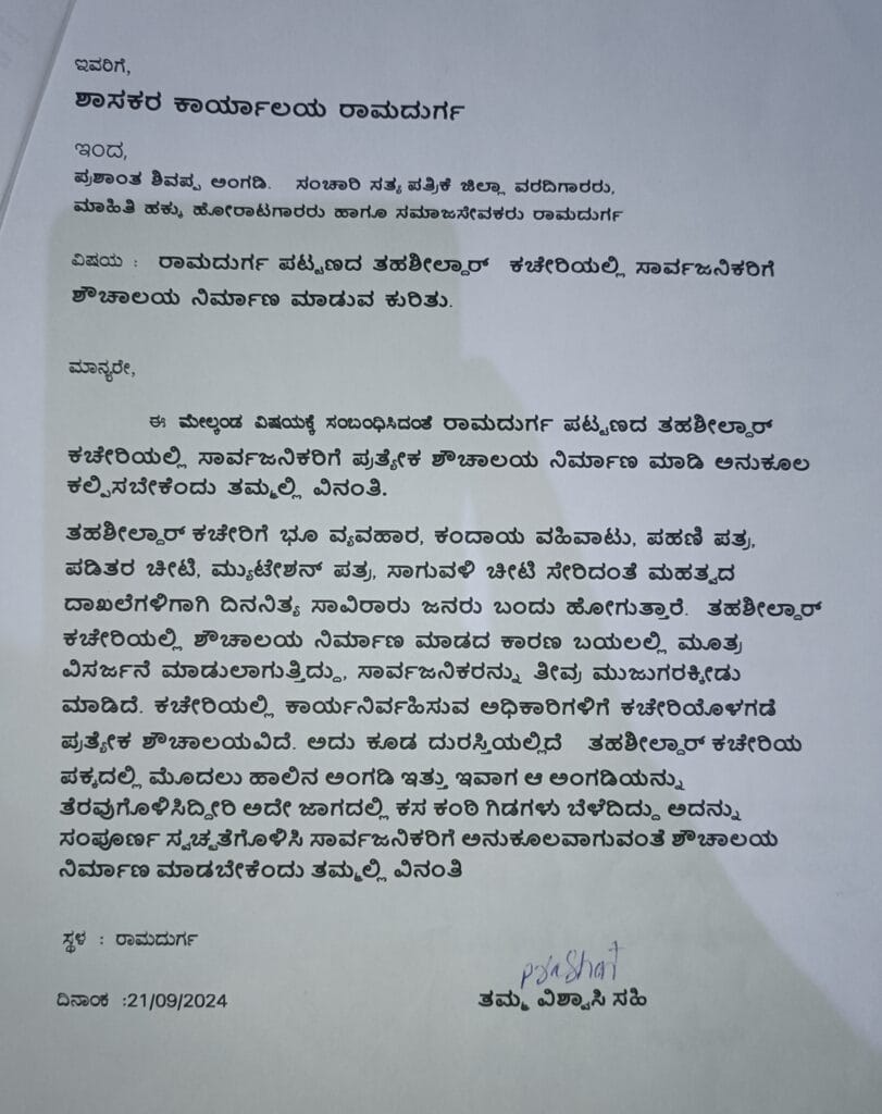 ತಾಲೂಕು ಕಚೇರಿಯಲ್ಲಿ ತಹಶೀಲ್ದಾರ್ ಕಚೇರಿ, ಚುನಾವಣಾ ಶಾಖೆ, ಖಜಾನಾಧಿಕಾರಿಗಳ ಕಚೇರಿ, ಆಹಾರ ಇಲಾಖೆ, ಕಂದಾಯ ಇಲಾಖೆ , ಸಮಾಜ ಕಲ್ಯಾಣ ಇಲಾಖೆ, ಶಿಶು ಅಭಿವೃದ್ಧಿ ಇಲಾಖೆ, ನೊಂದಣಿ ಇಲಾಖೆ, ಗ್ರಾಮ ಲೆಕ್ಕಿಗರು, ಭೂ ಮಾಪನ, ಭೂಮಿ ಶಾಖೆ, ನಾಡಕಚೇರಿ , ಶಿರಸ್ತೇದಾರ್ ಕಚೇರಿಗಳಿದ್ದು, ಪ್ರತಿನಿತ್ಯ ಸಾವಿರಾರು ಮಂದಿ ಸರ್ಕಾರಿ ದಾಖಲಾತಿಗಳಿಗೆ ತಾಲೂಕು ಕಚೇರಿಗೆ ಭೇಟಿ ನೀಡುತ್ತಾರೆ. ಆದರೆ ಸಾರ್ವಜನಿಕರಿಗೆ ಮೂಲಭೂತ ಅವಶ್ಯಕತೆಯಾದ ಶೌಚಾಲಯವೇ ಇಲ್ಲದಿರುವದು ದುರಂತ. ತಾಲೂಕು ದಂಡಾಧಿ ಕಾರಿಗಳ ಕಚೇರಿಯಲ್ಲೇ ಇಂತಹ ಅವ್ಯವಸ್ಥೆಯಿರುವದು ಸಂಕೋಚದ ಸಂಗತಿ ಇದರ ಬಗ್ಗೆ ಸಂಚಾರಿ ಸತ್ಯಪತ್ರಿಕೆ ಜಿಲ್ಲಾ ವರದಿಗಾರ ಹಾಗೂ ಮಾಹಿತಿ ಹಕ್ಕು ಹೋರಾಟಗಾರ, ಸಮಾಜ ಸೇವಕರಾದ ಪ್ರಶಾಂತ್ ಅಂಗಡಿ ಅವರು ರಾಮದುರ್ಗ ತಹಶೀಲ್ದಾರ ಹಾಗು ತಾಲೂಕಾ ದಂಡಾಧಿಕಾರಿಗಳಾದ ಪ್ರಕಾಶ ಹೊಳೆಪ್ಪಗೋಳ ಇವರ ಗಮನಕ್ಕೆ ತಂದರು ಕೂಡ ಇದುವರೆಗೂ ಸಾರ್ವಜನಿಕರಿಗೆ ಶೌಚಾಲಯದ ವ್ಯವಸ್ಥೆ ಕಲ್ಪಿಸದೇ ಇರುವದು ಬೇಸರದ ಸಂಗತಿ ಯಾಗಿದೆ ಇದರ ಬಗ್ಗೆ ದಿನಾಂಕ. 21-09-2024 ರಂದು ತಹಶೀಲ್ದಾರ್ ಕಚೇರಿ ಹಾಗೂ ಶಾಸಕರ ಕಾರ್ಯಾಲಯ ರಾಮದುರ್ಗ ಇವರಿಗೂ ಕೂಡ ಒಂದು ಮನವಿಯನ್ನು ಸಲ್ಲಿಸಿದರು ಕೂಡ ಇದುವರೆಗೂ ನನ್ನ ಅರ್ಜಿಗೆ ಯಾವುದೇ ಉತ್ತರ ನೀಡದೆ ಹಾಗೂ ಸಾರ್ವಜನಿಕರಿಗೆ ಶೌಚಾಲಯವನ್ನು ಕಲ್ಪಿಸದೆ ಇರುವುದು ಬೇಸರದ ಸಂಗತಿ ಯಾಗಿದೆ.