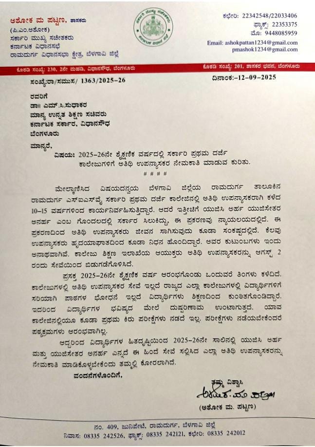 ಪ್ರಸಕ್ತ 2025-26ನೇ ಶೈಕ್ಷಣಿಕ ವರ್ಷ ಆರಂಭಗೊಂಡು ಒಂದುವರೆ ತಿಂಗಳು ಕಳೆದಿದೆ. ಕಾಲೇಜುಗಳಲ್ಲಿ ಅತಿಥಿ ಉಪನ್ಯಾಸಕರ ಸೇವೆ ಇಲ್ಲದೆ ರಾಜ್ಯದ ಎಲ್ಲಾ ಕಾಲೇಜುಗಳಲ್ಲಿ ವಿದ್ಯಾರ್ಥಿಗಳಿಗೆ ಸರಿಯಾಗಿ ಪಾಠಗಳ ಭೋಧನೆ ಇಲ್ಲದೆ ವಿದ್ಯಾರ್ಥಿಗಳು ಶಿಕ್ಷಣದಿಂದ ಕುಂಠಿತಗೊಂಡಿದ್ದಾರೆ. ಇದರಿಂದ ವಿದ್ಯಾರ್ಥಿಗಳ ಭವಿಷ್ಯದ ಮೇಲೆ ದುಷ್ಪರಿಣಾಮ ಉಂಟಾಗುತ್ತದೆ. ಯಾವ ಕಾಲೇಜಿನಲ್ಲಿಯೂ ಕೂಡಾ ಪ್ರಥಮ ಕಿರು ಪರೀಕ್ಷೆಗಳು ನಡದೆ ಇಲ್ಲ. ಪರೀಕ್ಷೆಗಳು ನಡೆಯಬೇಕೆಂದರೆ ಪಠ್ಯಕ್ರಮಗಳು ಆರಂಭವಾಗಿಲ್ಲವೆಂದ ಶಾಸಕರು,ವಿದ್ಯಾರ್ಥಿಗಳ ಹಿತದೃಷ್ಟಿಯಿಂದ 2025-26ನೇ ಸಾಲಿನಲ್ಲಿ ಯುಜಿಸಿ ಅರ್ಹ ಮತ್ತು ಯುಜಿಸೇತರ ಅನರ್ಹ ಎನ್ನದೆ ಈ ಹಿಂದೆ ಸೇವೆ ಸಲ್ಲಿಸಿದ ಎಲ್ಲಾ ಅತಿಥಿ ಉಪನ್ಯಾಸಕರನ್ನು ನೇಮಕಾತಿ ಮಾಡಿಕೊಳ್ಳಬೇಕೆಂದು ಮುಖ್ಯಮಂತ್ರಿಗಳು ಹಾಗೂ ಉನ್ನತ ಶಿಕ್ಷಣ ಸಚಿವರನ್ನು ಕೋರಿದ್ದಾರೆಂದು ತಿಳಿಸಿದ್ದಾರೆ.