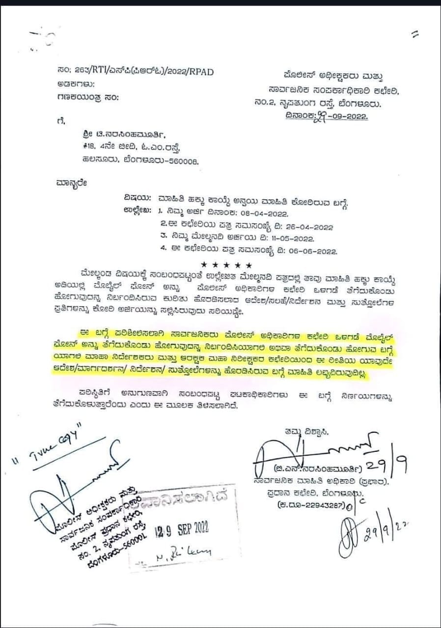 ಮಾಹಿತಿ ಹಕ್ಕು ಅರ್ಜಿಗೆ, ಕರ್ನಾಟಕ ರಾಜ್ಯ ಪೊಲೀಸ್ ಮಹಾನಿರ್ದೇಶಕರ (DG & IGP) ಕಚೇರಿಯೇ ಅಧಿಕೃತವಾಗಿ ಬದಲು ನೀಡಿದೆ. “ಸಾರ್ವಜನಿಕರು ಪೊಲೀಸ್ ಅಧಿಕಾರಿಗಳ ಕಚೇರಿ ಒಳಗಡೆ ಮೊಬೈಲ್ ಫೋನ್ ತೆಗೆದುಕೊಂಡು ಹೋಗುವುದನ್ನು ನಿರ್ಬಂಧಿಸಿ ಇಲ್ಲವೇ ತೆಗೆದುಕೊಂಡು ಹೋಗುವ ಬಗ್ಗೆ, ಮಹಾನಿರ್ದೇಶಕರ ಕಚೇರಿಯಿಂದ ಯಾವುದೇ ಆದೇಶ, ಮಾರ್ಗದರ್ಶನ ಇಲ್ಲವೇ ಸುತ್ತೋಲೆಗಳನ್ನು ಹೊರಡಿಸಿರುವ ಬಗ್ಗೆ ಮಾಹಿತಿ ಲಭ್ಯವಿರುವುದಿಲ್ಲ.”