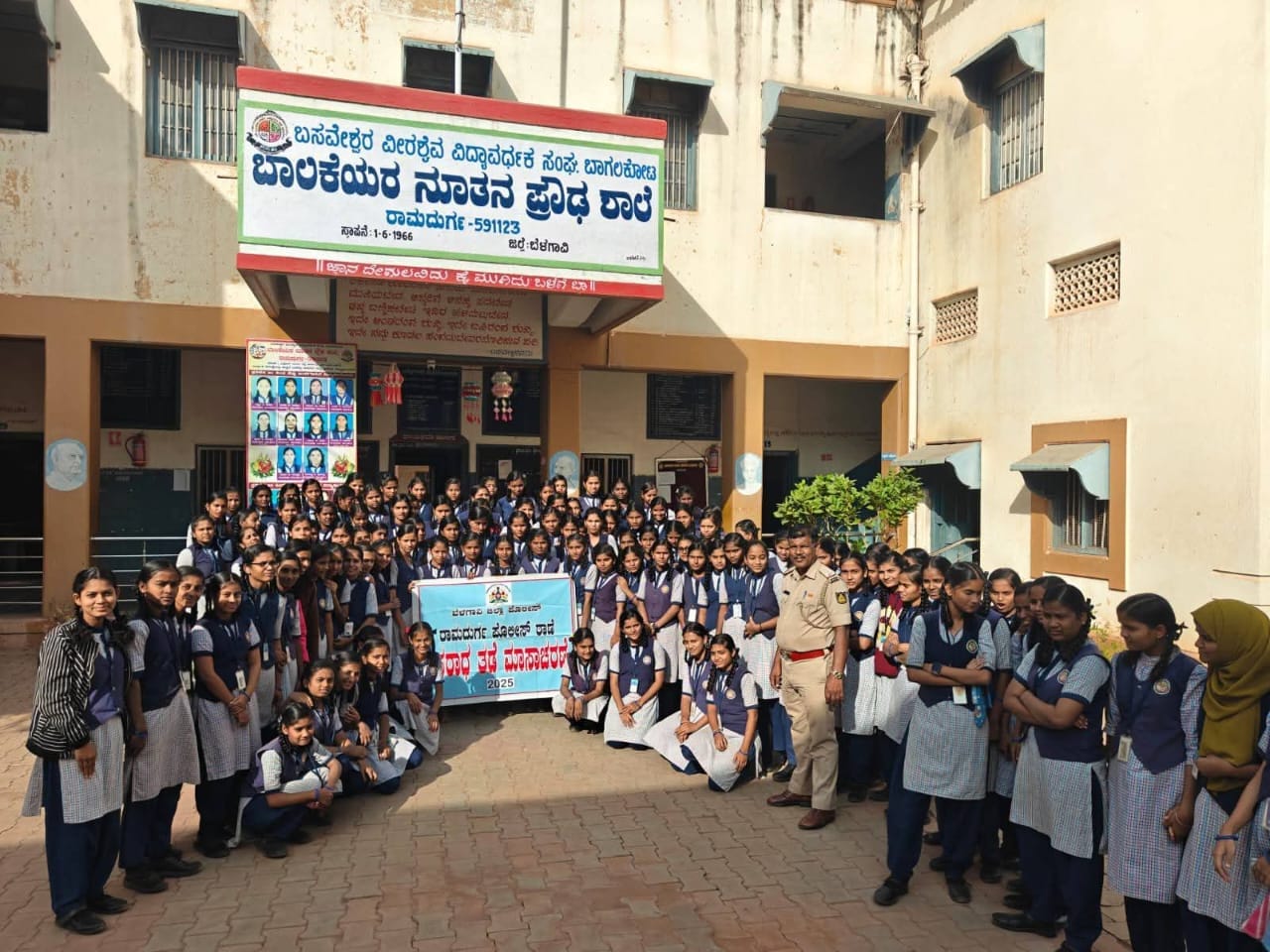 ಬೆಳಗಾವಿ ಜಿಲ್ಲೆ ರಾಮದುರ್ಗ ಪಟ್ಟಣದ ಬಸವೇಶ್ವರ ಬಾಲಿಕಿಯರ ನೂತನ ಪ್ರೌಢ ಶಾಲೆ ಆವರಣದಲ್ಲಿ ರಾಮದುರ್ಗ ಪೊಲೀಸ್ ಠಾಣೆ ವತಿಯಿಂದ ಶಾಲಾ ಮಕ್ಕಳಿಗೆ ಸಂಚಾರ ನಿಯಮಗಳ ಬಗ್ಗೆ ರಸ್ತೆ ಸುರಕ್ಷತೆ ಬಗ್ಗೆ ಹಾಗೂ ಸೈಬರ್ ಅಪರಾಧಗಳು ಮಾದಕ ವಸ್ತುಗಳ ಸೇವನೆಯಿಂದ ಉಂಟಾಗುವ ದುಷ್ಪರಿಣಾಮಗಳು ಇತರ ವಿಷಯಗಳ ಬಗ್ಗೆ ವಿದ್ಯಾರ್ಥಿಗಳಿಗೆ ಜಾಗೃತಿ ಮೂಡಿಸಲಾಯಿತು.